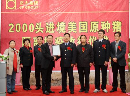 放行儀式上,陜西出入境檢驗(yàn)檢疫局代表做了檢疫放行報(bào)告:“經(jīng)過(guò)3個(gè)多月的隔離檢驗(yàn),正大集團(tuán)農(nóng)牧食品企業(yè)(中國(guó)區(qū))引進(jìn)的2000頭原種豬完全符合安全檢疫標(biāo)準(zhǔn),準(zhǔn)予放行。”陜西出入境檢驗(yàn)檢疫局代表為正大集團(tuán)陜西區(qū)陳強(qiáng)總裁頒發(fā)了《種豬檢疫合格證書(shū)》。