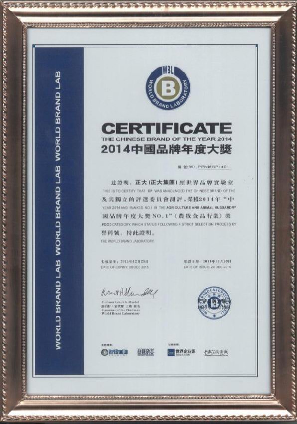 2014年12月29日,“總裁世界年會(huì)”在北京東方君悅大酒店舉行。本次大會(huì)揭曉了享有“中國品牌奧斯卡”之稱的 “世界品牌實(shí)驗(yàn)室2014年中國品牌年度大獎(jiǎng)”評(píng)選結(jié)果,正大集團(tuán)、中國國航、國家電網(wǎng)、騰訊控股、中國人壽、中國國旅、北汽集團(tuán)、華為技術(shù)、長虹電器等30個(gè)活躍在中國經(jīng)濟(jì)舞臺(tái)的領(lǐng)軍品牌榮獲 “中國品牌年度大獎(jiǎng)”,正大集團(tuán)以在農(nóng)牧食品業(yè)多年的探索實(shí)踐和管理經(jīng)驗(yàn),以及良好的產(chǎn)品品質(zhì)和品牌知名度,榮獲農(nóng)牧食品行業(yè)“中國品牌年度大獎(jiǎng)***”榮譽(yù)稱號(hào)。哈佛商學(xué)院教授約翰?戴騰博士(John Deighton)、耶魯大學(xué)管理學(xué)院教授萊維·多爾博士(Ravi Dhar)分別進(jìn)行頒獎(jiǎng)及致詞。